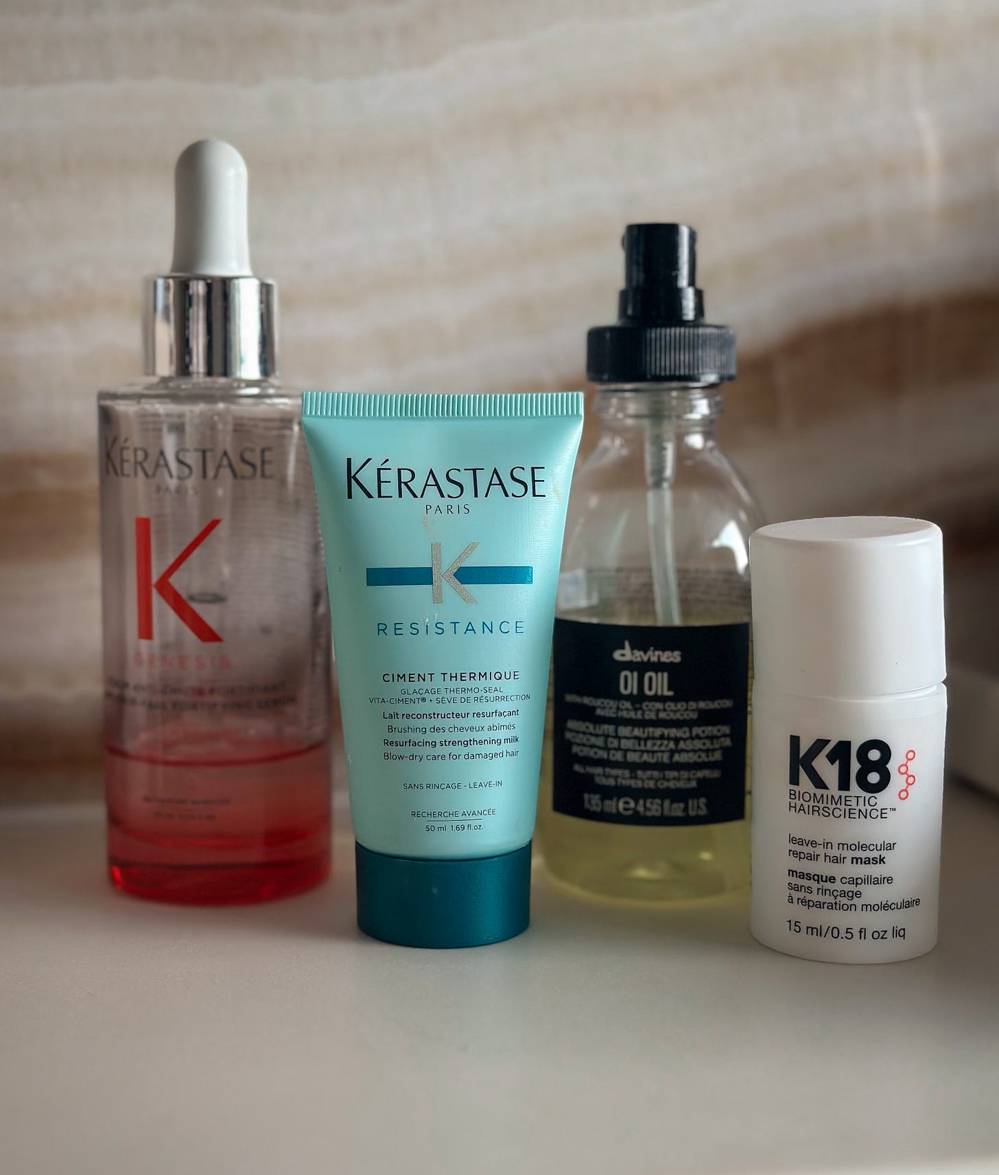 Não é uma resolução de ano novo mas tenho que usar mais os meus produtos de cabelo. O K18 é fantástico mas usualmente deixo secar o cabelo ao natural, e precisa de ser ativado por calor. O Kérastase Genesis preciso de usar com mais consistência. Gosto de todos, são uma curadoria de vários anos - Davines Oi Oil é o meu óleo leave-in preferido, e o Ciment Thermique é excelente, mas também precisa de ser ativado por calor. Claro que o que faz a maior diferença é o botox capilar que faço regularmente e me permite secar o cabelo ao natural.